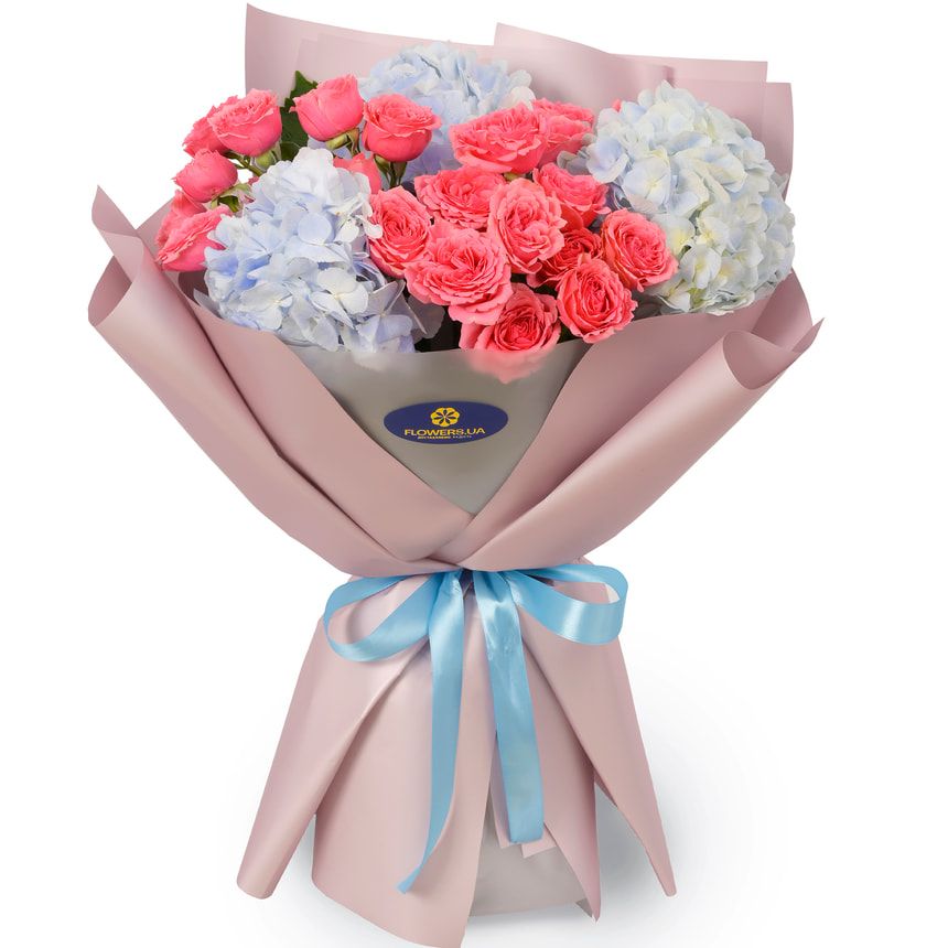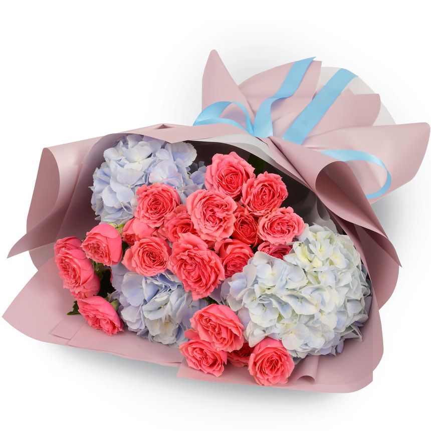 3 blue hydrangeas, 6 pink spray roses, decoration