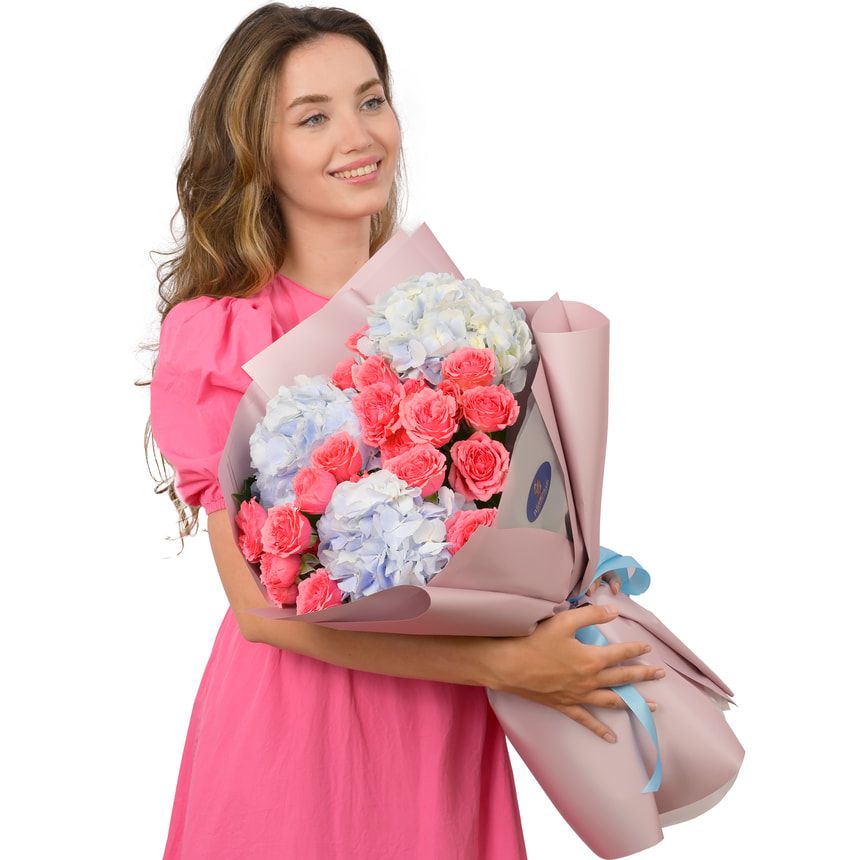 A Manifestation of Lightness, Tenderness, and Natural Harmony – the Liona bouquet is composed of lush blue hydrangeas and delicate pink spray roses, where each bloom brings its own character to the composition, while blending into a unified, harmonious whole.