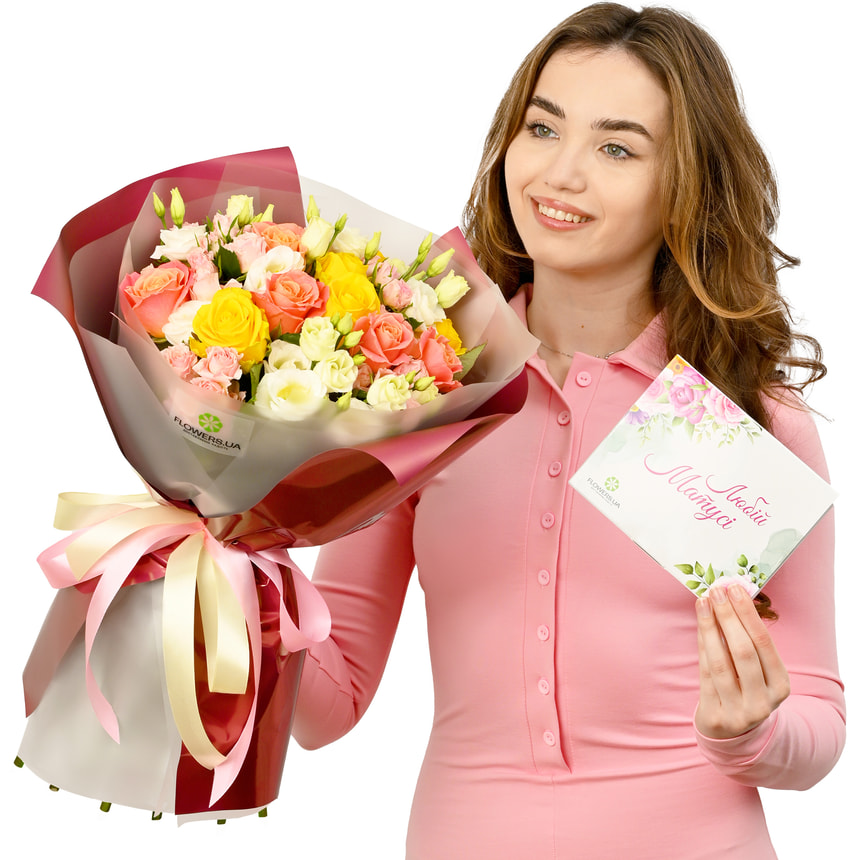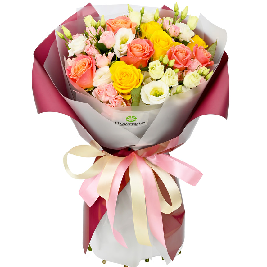 5 yellow roses, 5 coral roses, 6 spray pink roses, 3 branches of white eustoma, decoration