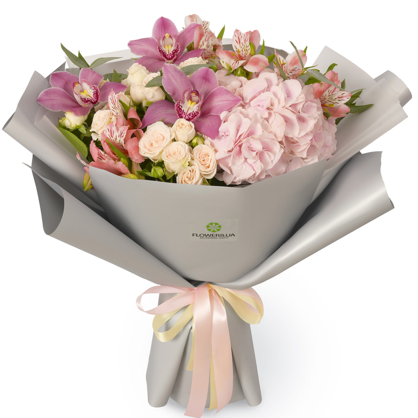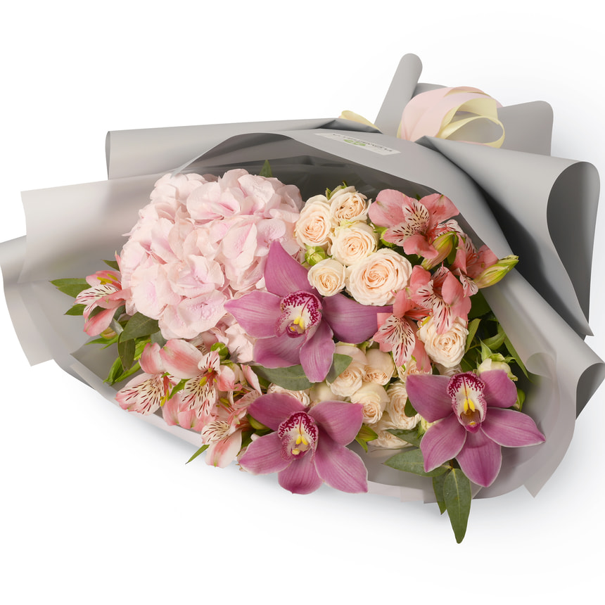 In the center of the bouquet are large, luxurious hydrangea flowers the color of cotton candy. They symbolize gratitude, sincerity and spiritual openness. Cymbidium orchids bloomed next to them - noble and exotic flowers that have been associated with grace, refined beauty and respect for centuries. Alstroemerias, scattered around the composition like a scattering of watercolor brushstrokes, add lightness, symbolizing friendship and devotion.