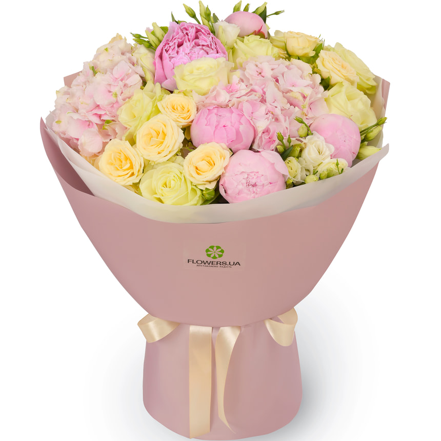 2 pink hydrangeas, 3 white eustomas, 4 branches of bush cream roses, 5 peonies, 7 white roses, decoration.