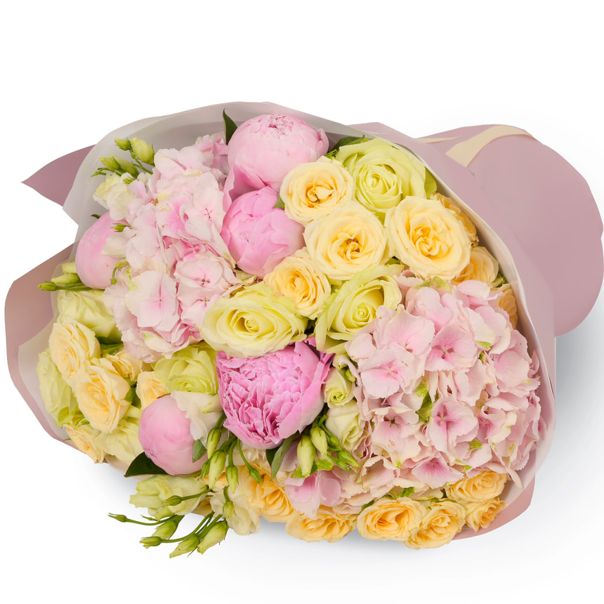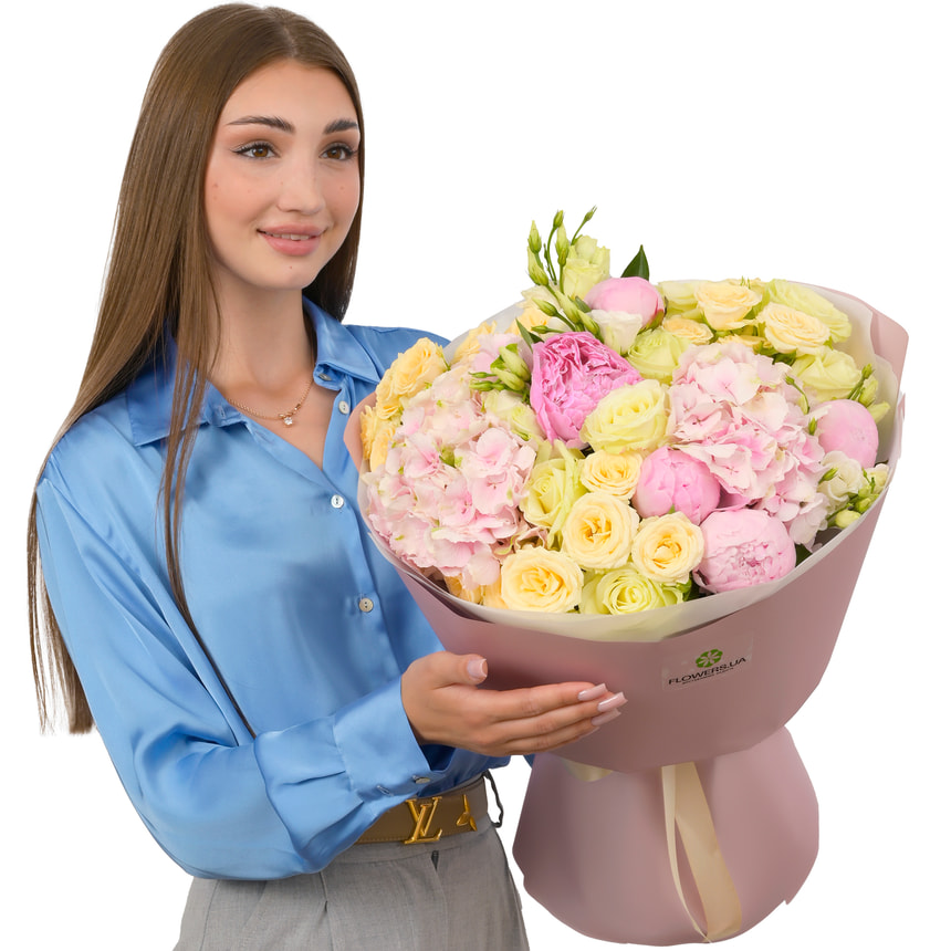 White eustoma bring fresh airiness to the arrangement. Their delicate buds harmonize beautifully with the voluminous hydrangeas and peonies, infusing the bouquet with grace.