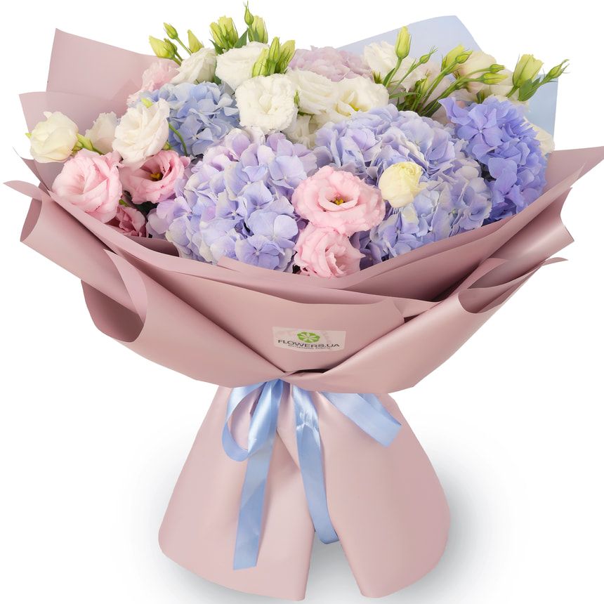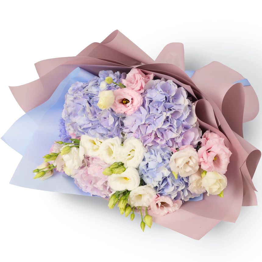 An embodiment of lightness, tenderness, and natural harmony — the “Softness” bouquet is composed of elegant white and pink eustomas and airy clusters of blue hydrangea, with each flower contributing its unique character to create a unified, harmonious arrangement.