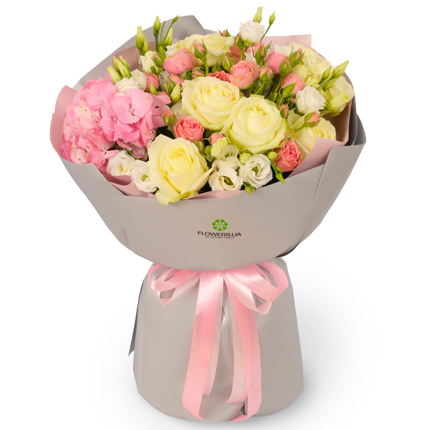 The white rose stands for purity and elegance, creating a calm and refined base for the bouquet. The pink spray rose brings tenderness and warmth, expressing affection and devotion. White lisianthus symbolizes trust and grace, while the pink hydrangea adds an airy softness and romantic dreaminess to complete the ensemble.