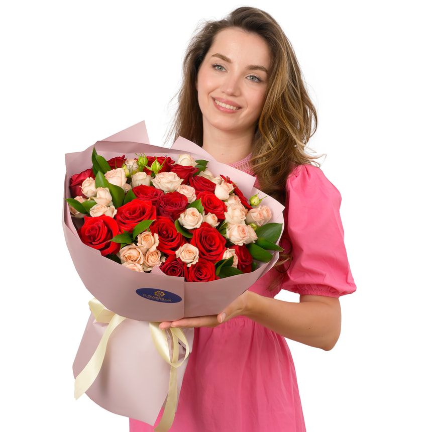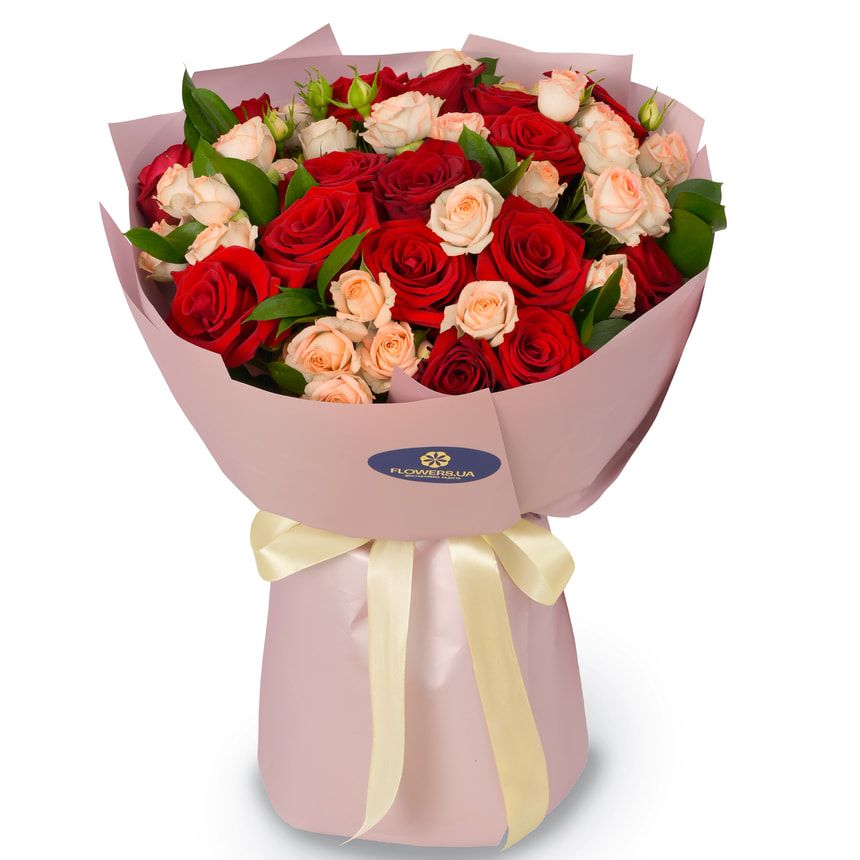 The “Magnificence of Passion” bouquet is an expression of deep emotions, timeless elegance, and passionate devotion. Featuring lush red roses — the classic symbol of love and desire — paired with soft peach spray roses representing tenderness, care, and affection, this bouquet tells a story of true love in all its shades.