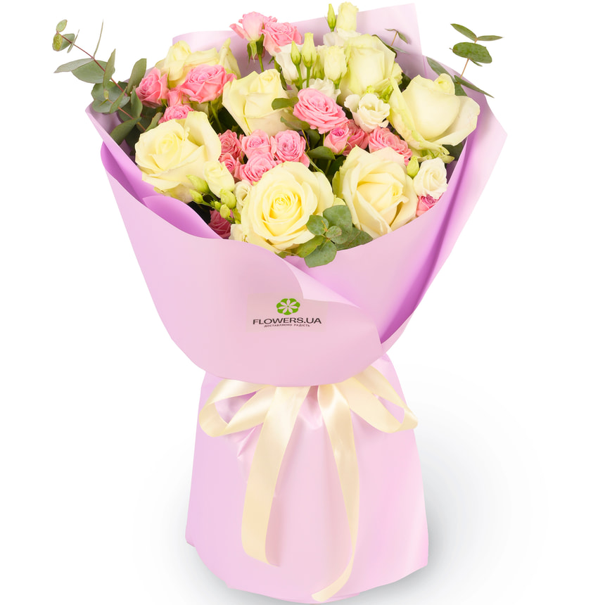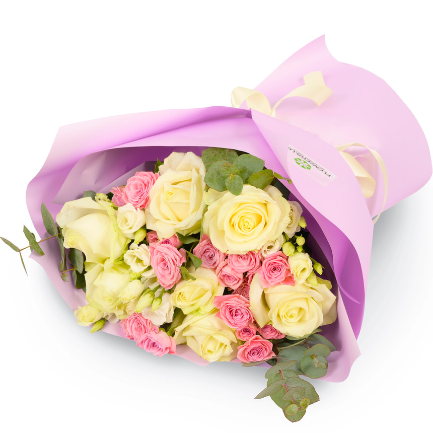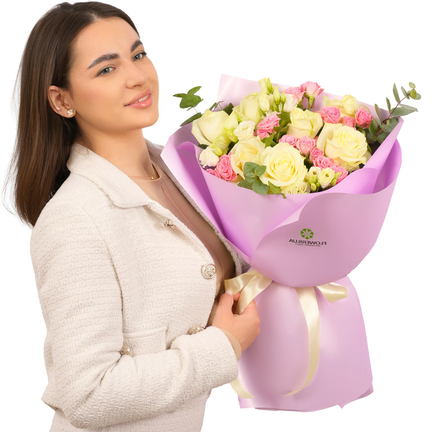 The exquisite, graceful "Her Majesty" bouquet is composed of classic white roses, pink spray roses, white eustomas, and fragrant eucalyptus. Its white-and-pink palette is the language of romance — always in style. Such combinations are the foundation of truly gentle, harmonious, and memorable bouquets.