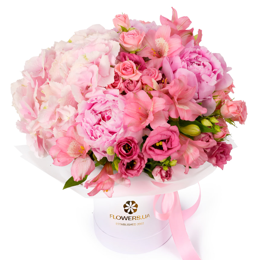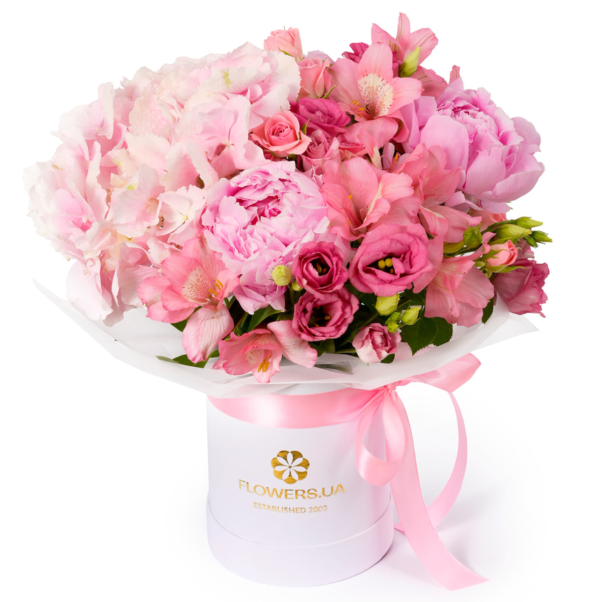 3 peonies, 1 pink hydrangea, 3 alstroemerias, 3 pink eustomas, 3 branches of pink bush roses, box 15*17, floristic material, design.