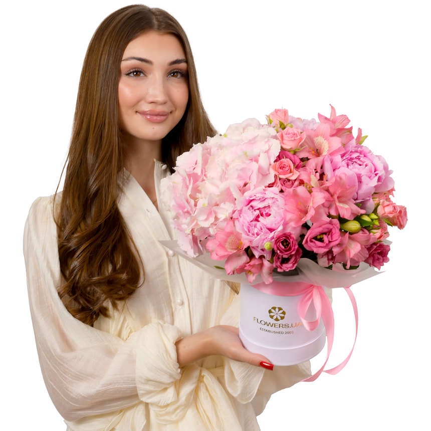 At the heart of the bouquet are lush peonies, open like secrets of love. Soft hydrangeas symbolize elegance and grace, while miniature roses, lisianthus, and alstroemerias add variety in form and texture, bringing the whole composition to life with movement and emotion.