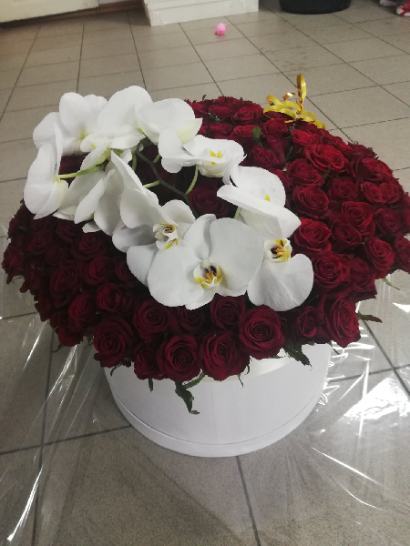 151 red roses, 2 orchid branches, decorative gift box 42 sm*27 sm, floral material.
