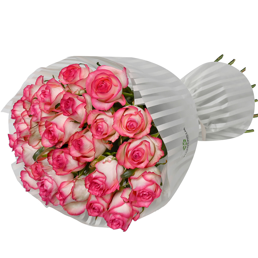 Букет из 25 роз сорта Джумилия — это воплощение нежности, элегантности и романтической утончённости. Каждая роза в этом букете — настоящее произведение природы: крупные, плотные бутоны с кремовой основой и ярко-розовой каймой по краю лепестков создают невероятно гармоничную и выразительную композицию. Такое сочетание цветов символизирует чистоту чувств, искреннюю симпатию и благородство.