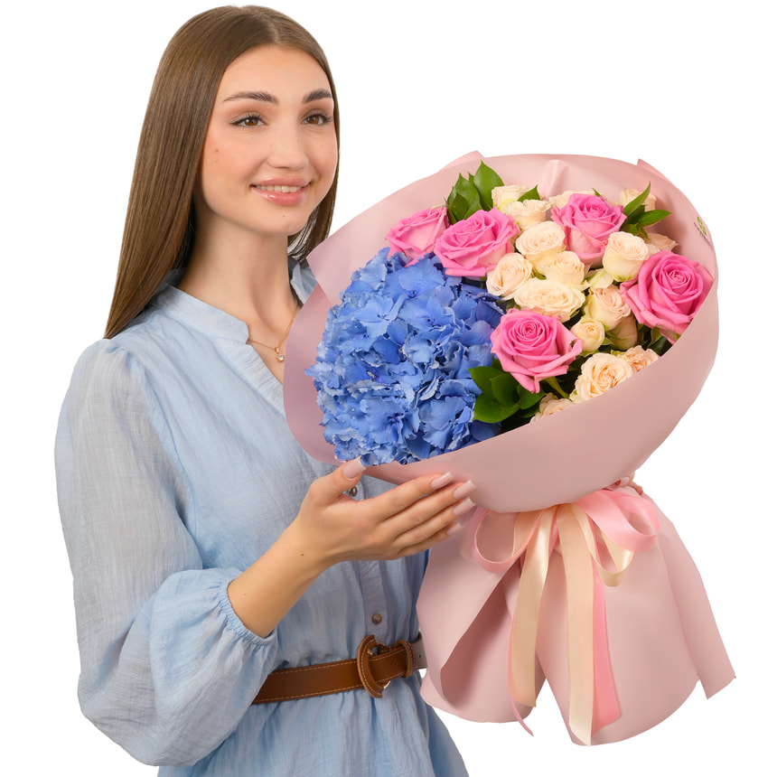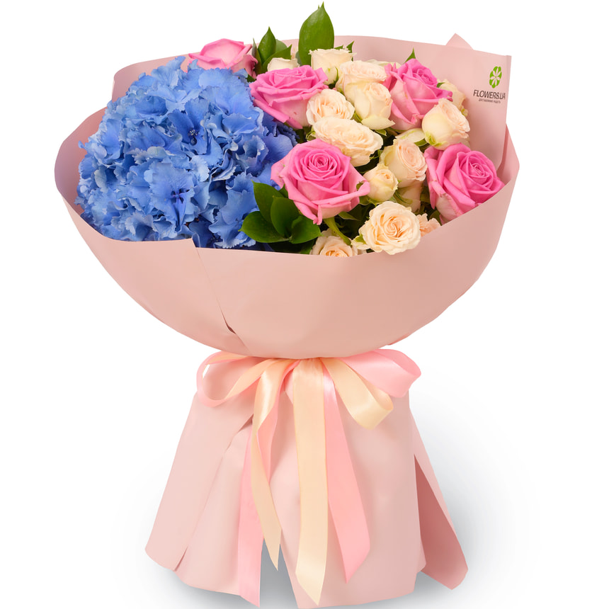 1 голубая гортензия (оттенок может отличаться), 5 розовых роз, 5 кустовых кремовых роз, зелень, оформление.