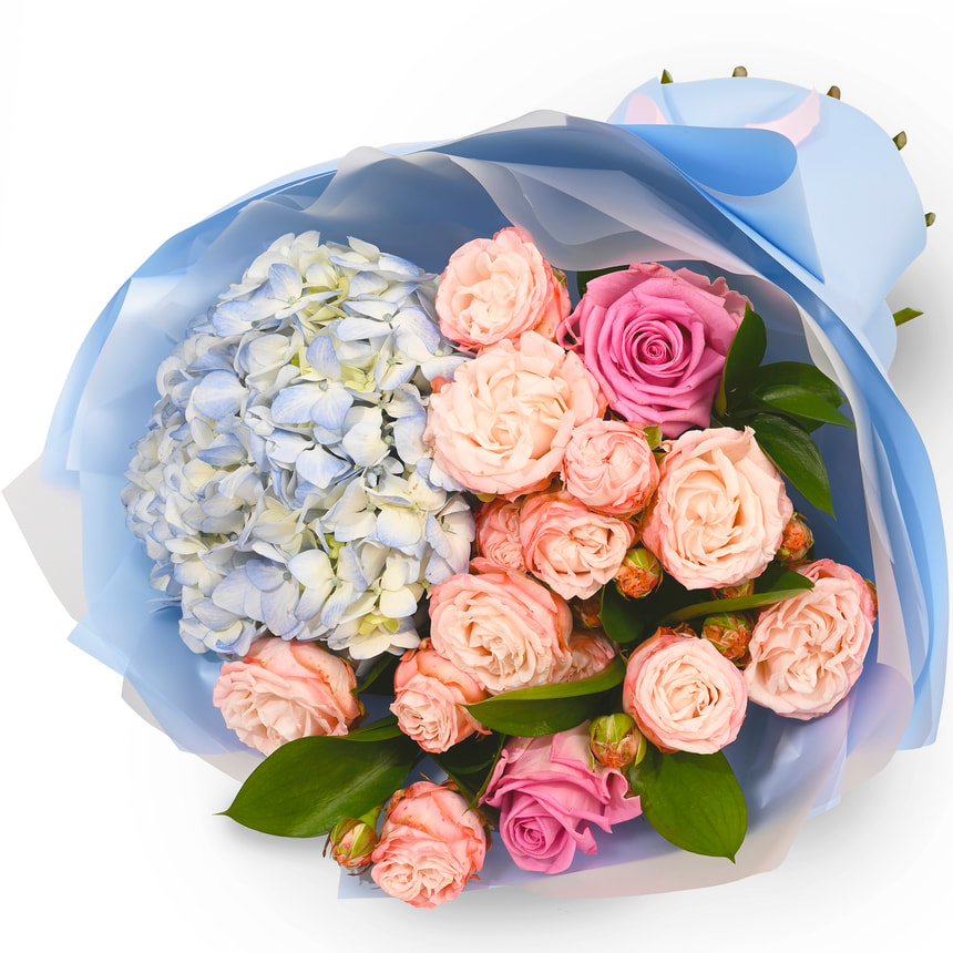 1 голубая гортензия, 3 ветки кустовой пионовидной розовой розы, 2 розовые розы, зелень, оформление.