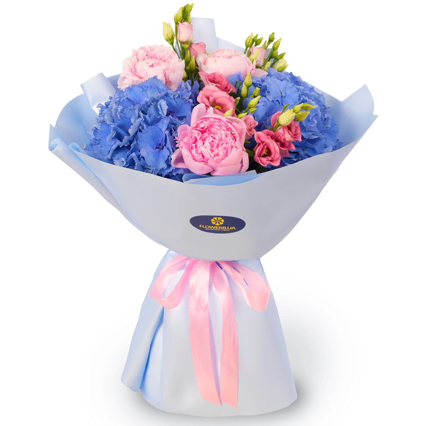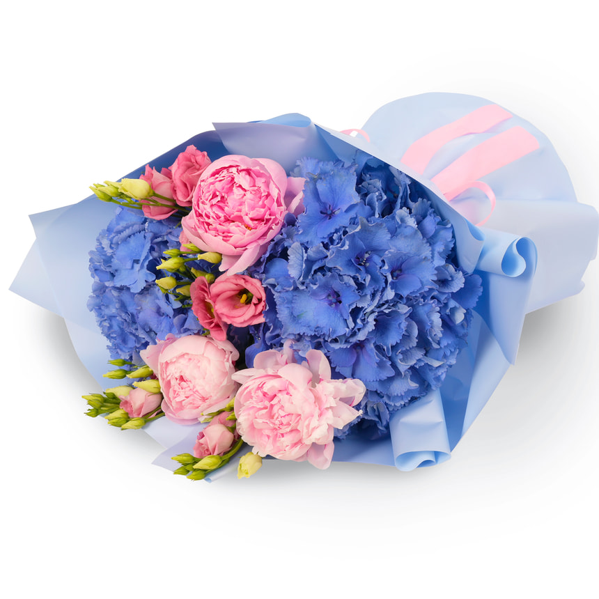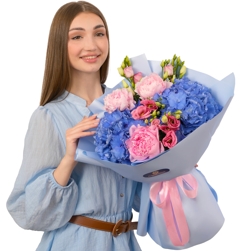 Яркие голубые соцветия гортензии, роскошные розовые пионы и трепетные розовые эустомы слились в утончённую и гармоничную композицию "Тайна океана".