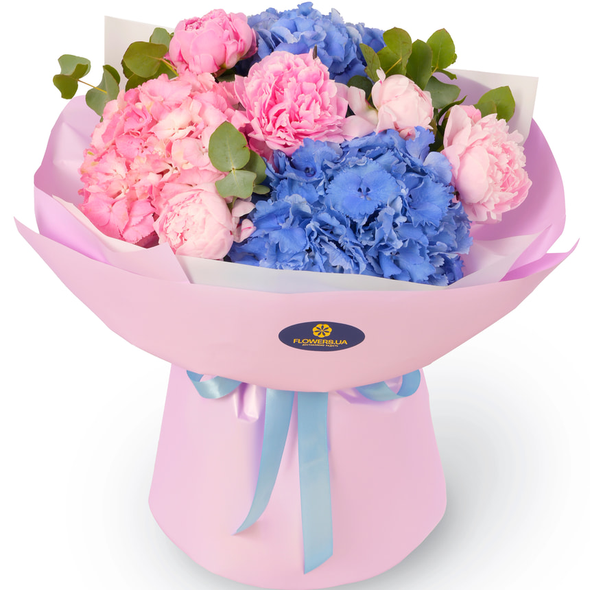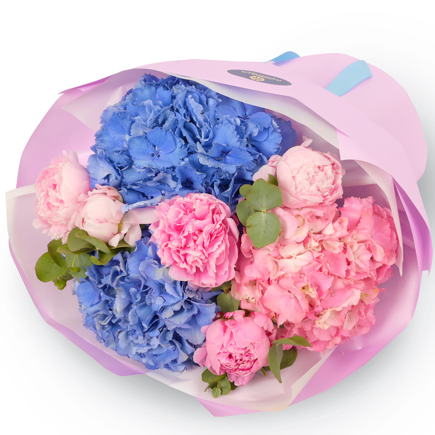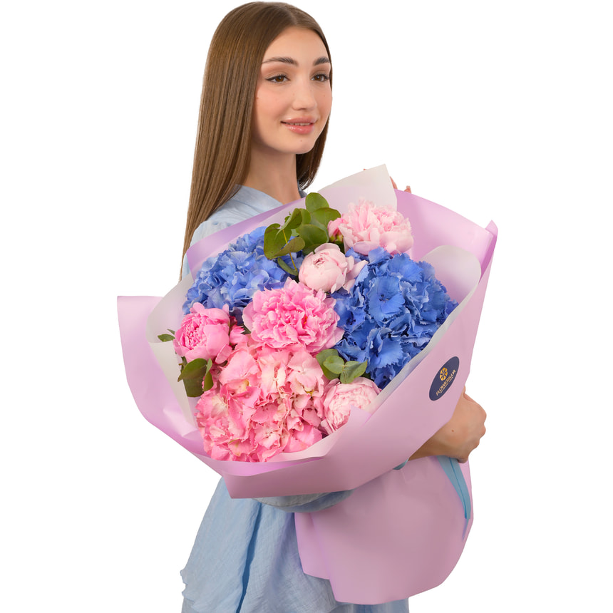 2 голубые гортензии, 1 розовая гортензия, 6 пионов, зелень, оформление.