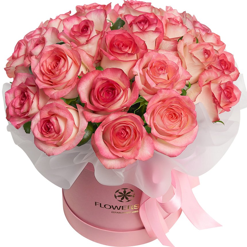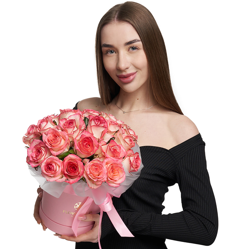 Эта изысканная коробка с розами сорта Джумилия — воплощение элегантности, романтики и утончённости. Розы Джумилия славятся своей изысканной окраской: лепестки имеют нежную кремовую основу, которая плавно переходит в насыщенный розовый край, создавая впечатляющий градиент и подчёркивая изящество каждого бутона.