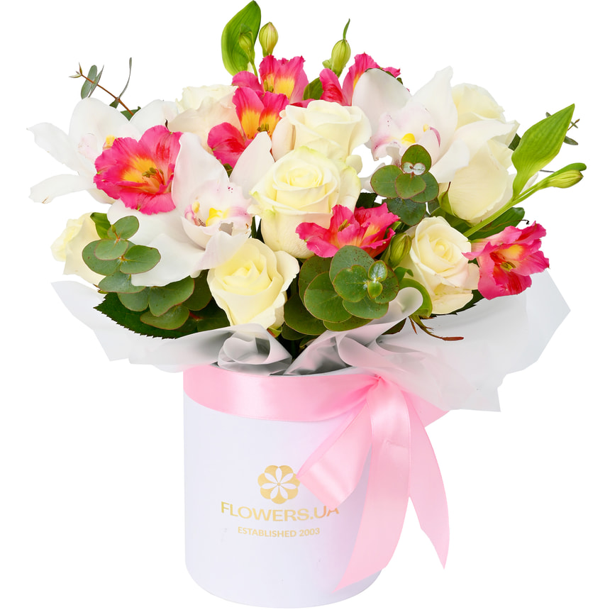 8 белых роз, 2 альстромерии, 3 цветка белой орхидеи, зелень, флористический материал, оформление.