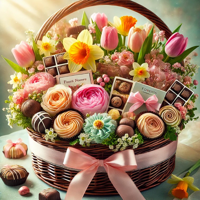 Подарунковий кошик із делікатесами або елегантний букет у коробці стануть чудовим вибором для офіційного привітання.
