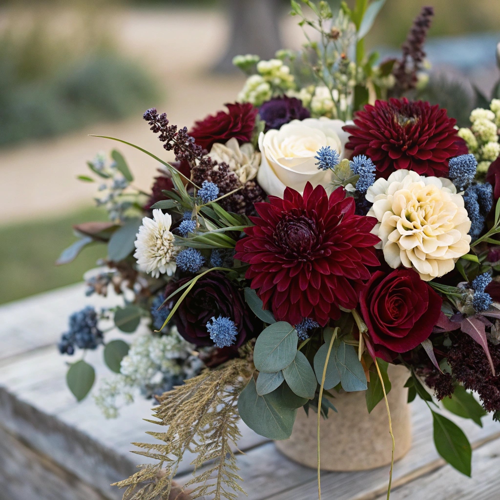 Не забуваймо про педагогів-чоловіків. Вони теж заслуговують на елегантний подарунок. Темно-червоні, бордові, сині, кремові відтінки — в поєднанні з мінімалістичним оформленням — створюють стриману, солідну композицію. Ідеальний варіант — квітковий подарунок у коробці або крафтовому папері з лаконічною стрічкою.