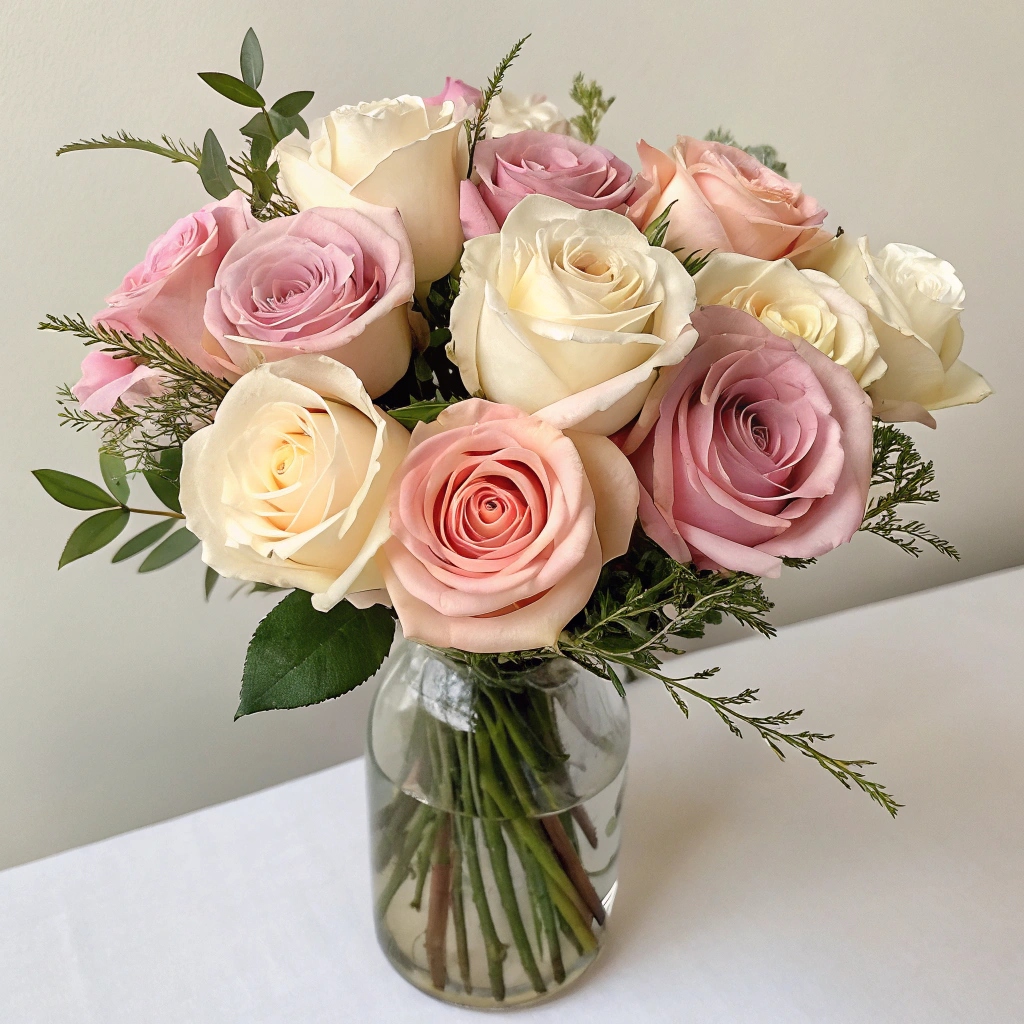 Безпрограшний варіант — троянди у гармонійній палітріі. Композиція може бути оформлена у кошику або стриманій упаковці. Це класична ніжність у композиції, яка сприймається як знак глибокої шани.