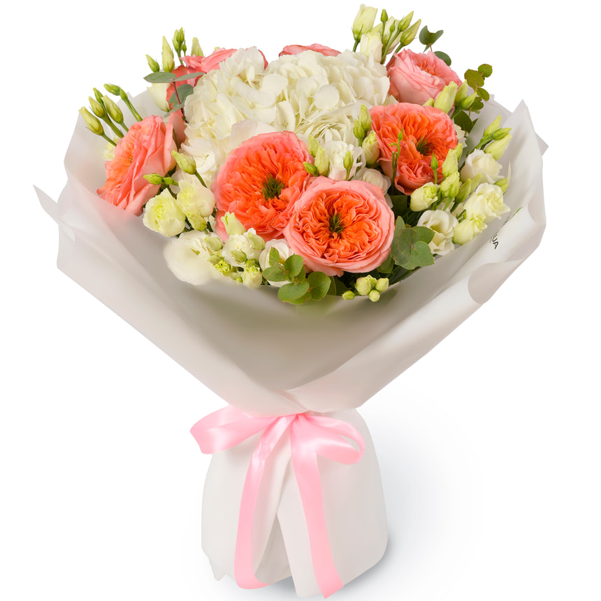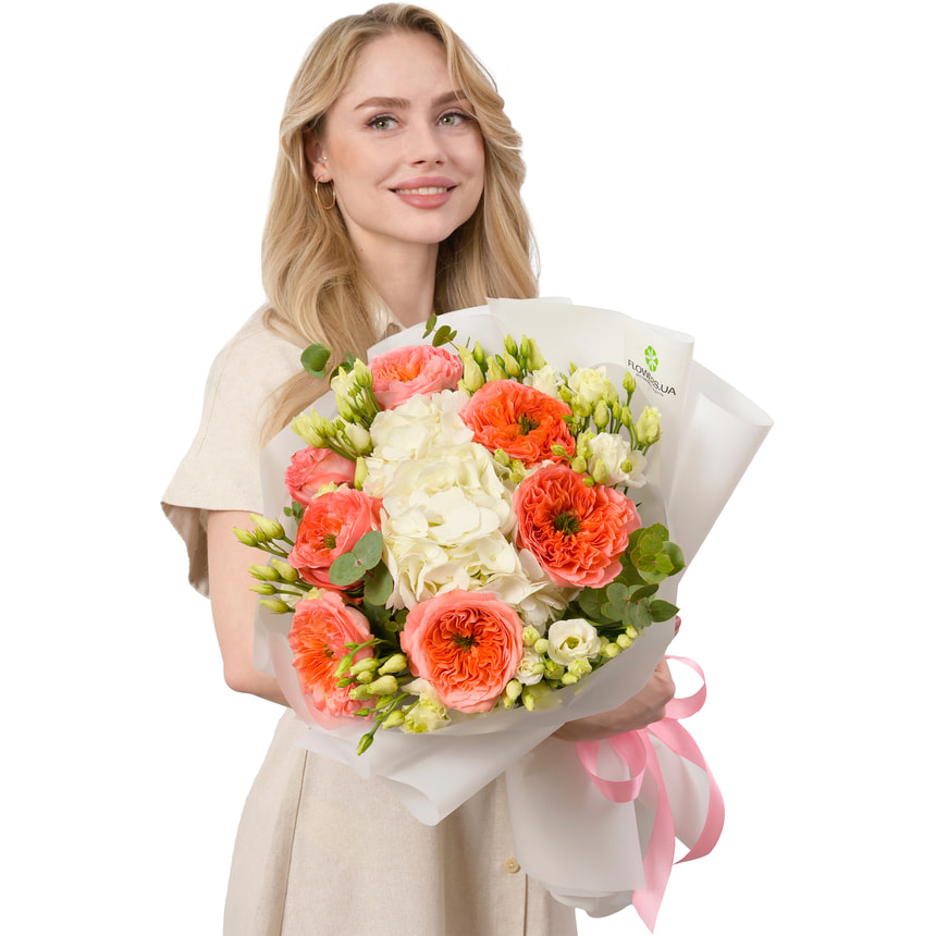 Романтичний, неймовірно красивий і ніжний букет «Мрія в Парижі», наче натхненний квітковими натюрмортами старих майстрів, складений з півонієподібних троянд сорту «Мандарин», білих еустом і суцвіть білої гортензії.