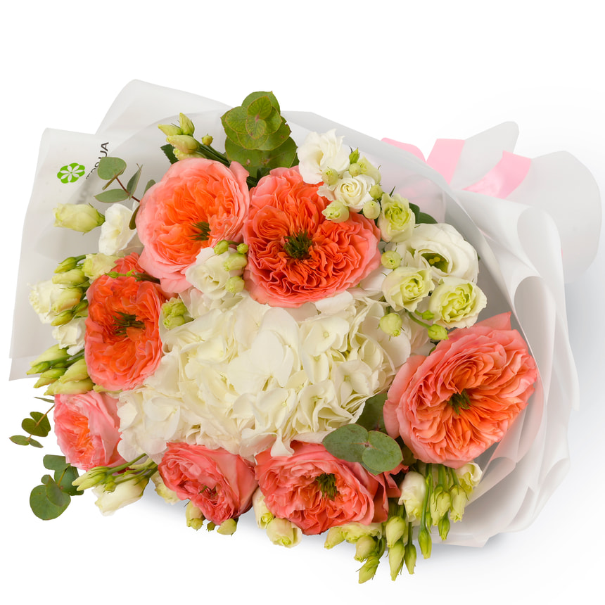 Великі, махрові бутони дуже схожі на півонії, мають насичений мандариновий відтінок, який дивує. Багатошарові пелюстки густо складені навколо відкритої серцевини, а видима зелена бахрома робить троянду ще більш незвичайною. Помаранчеві троянди яскравим хороводом оточують повітряну білосніжну кулю гортензії. Суцвіття гортензії займає центральне місце в букеті. М'який, ніжний помпон має статусний і масивний вигляд, одночасно легкий і невагомий, робить букет об'ємним і розкішним. Білосніжна еустома прикрашає композицію своєю присутністю. Об'єднавши в собі витонченість троянди і ніжність мережива, еустома не залишає нікого байдужим. Красиві білі бутони, молоді зелені пагони додають букету декоративності та універсальності.