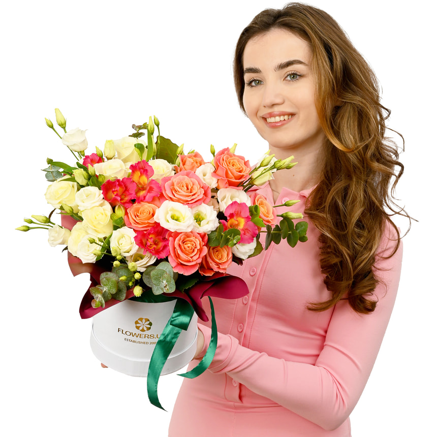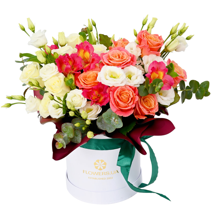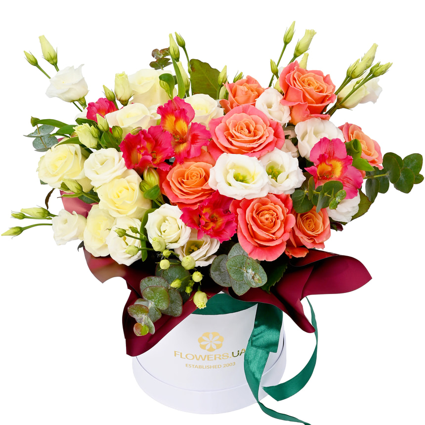 7 білих троянд, 7 коралових троянд, 3 білі еустоми, 1 альстромерія, зелень, коробка 15*17, флористичний матеріал, оформлення.